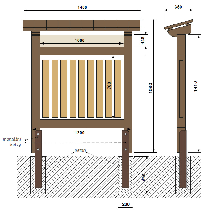 Vyrobeno z masivního smrkového KVH hranolu. Materiál dřevěných lamel odpovídá druhu ilustrovaných dřevin. Střecha je šindelová. Součástí prvku je kotvící materiál k zabetonování (ocelová kotva L, spojovací materiál, počet dle potřeb stojanu).