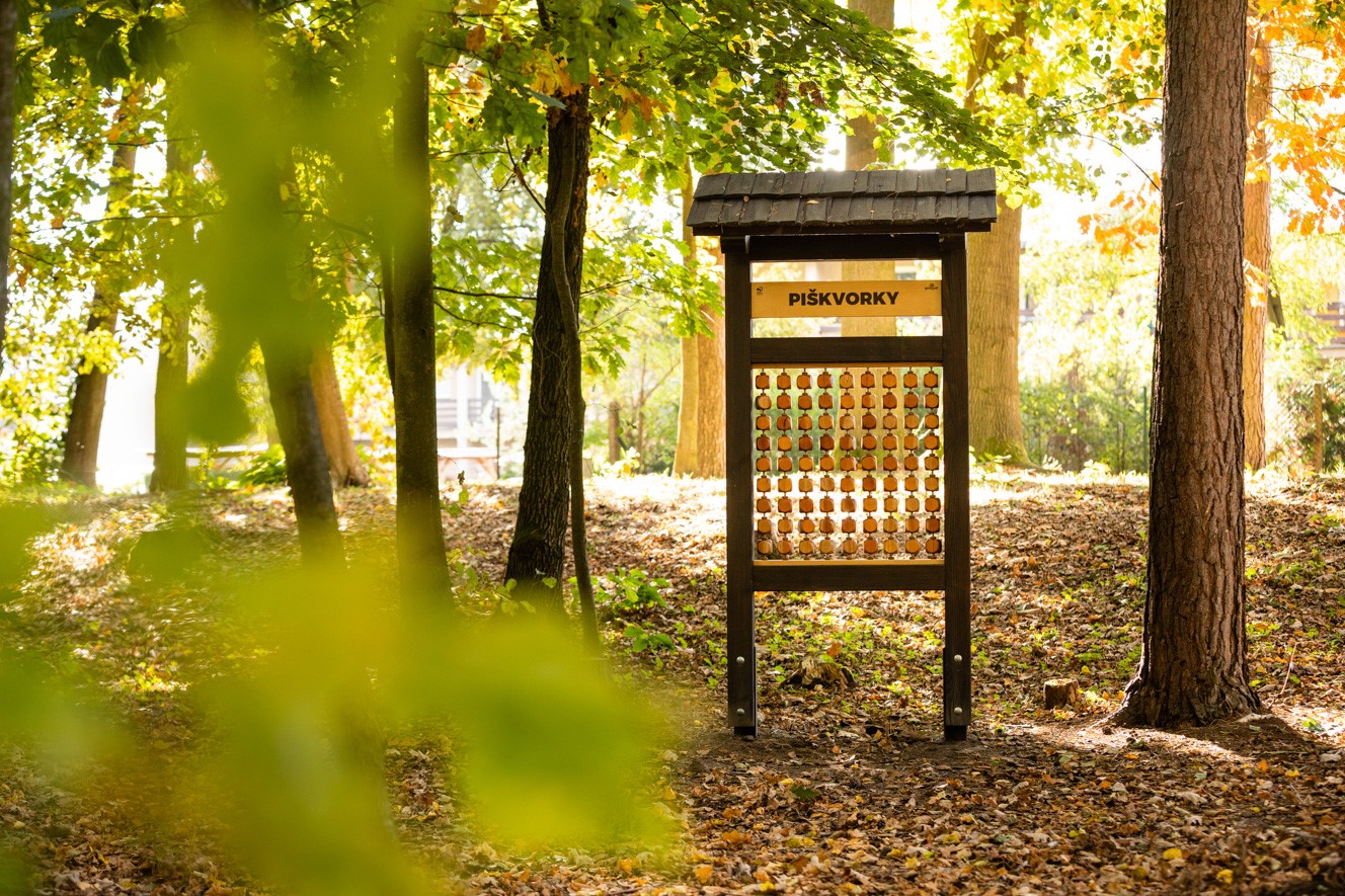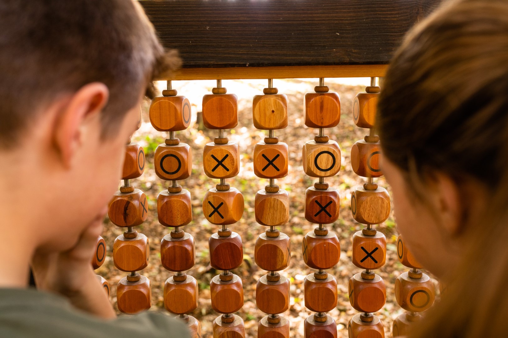 Interaktivní naučný prvek s piškvorkami, které obsahuje otočné dřevěné kostičky.