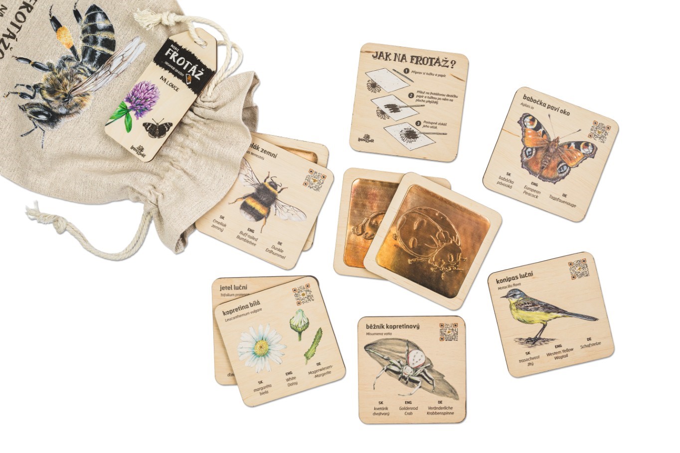 Objevte kouzlo frotážování. 10 interaktivních destiček 9x9 cm s lučními motivy. QR kódy, multijazyčné provedení.