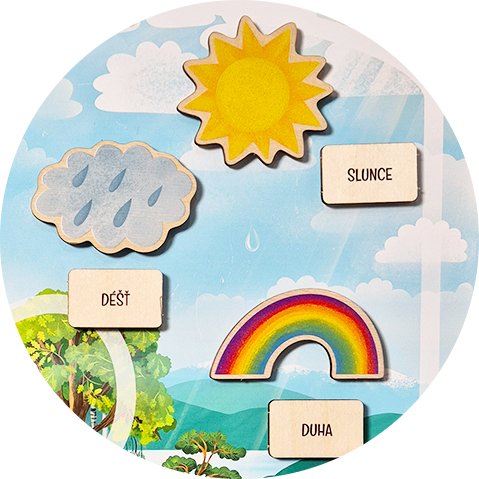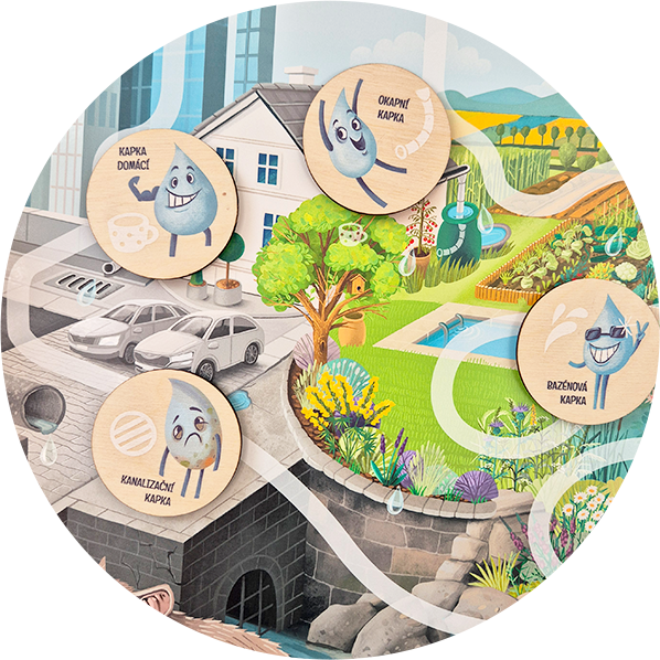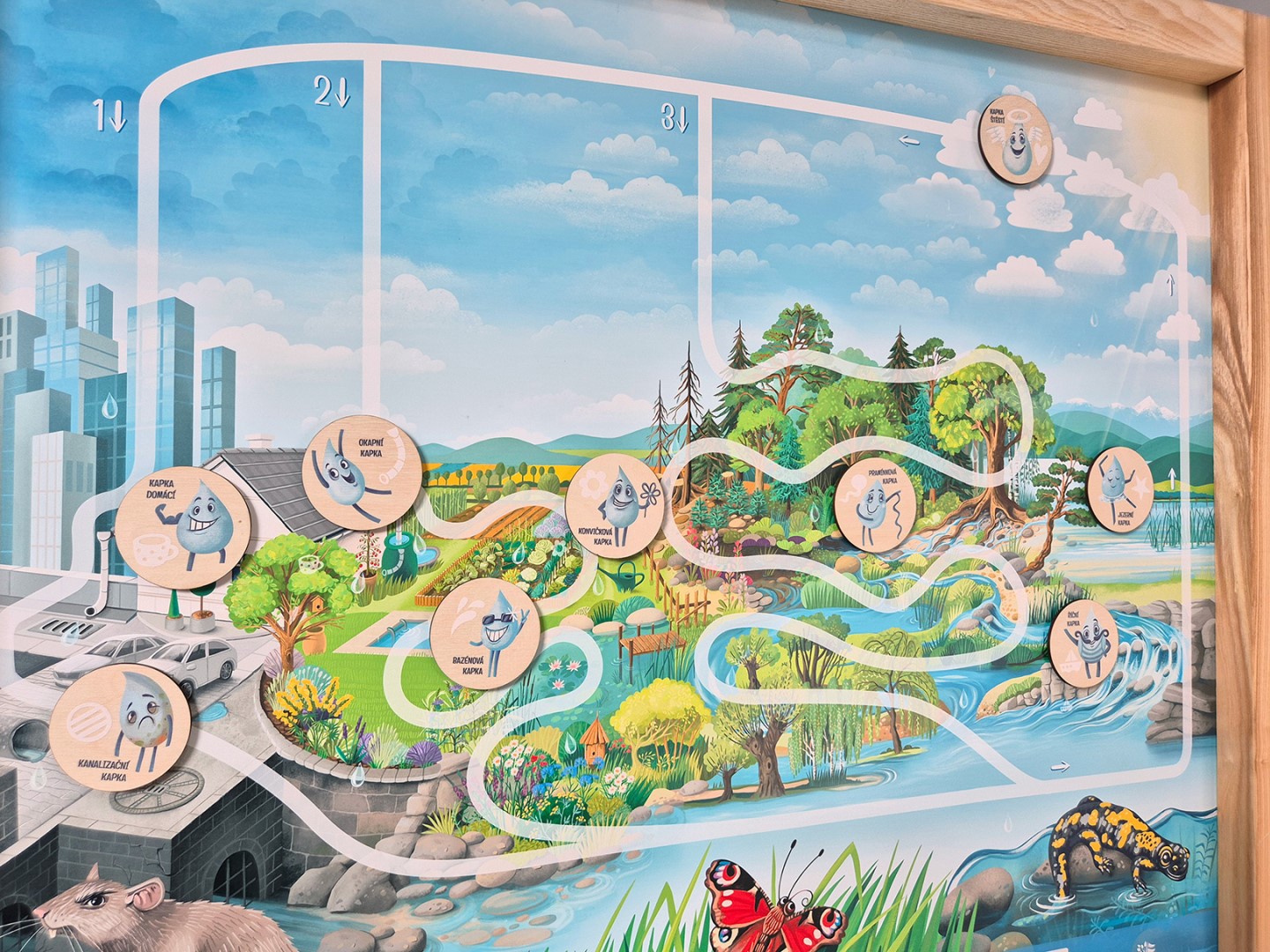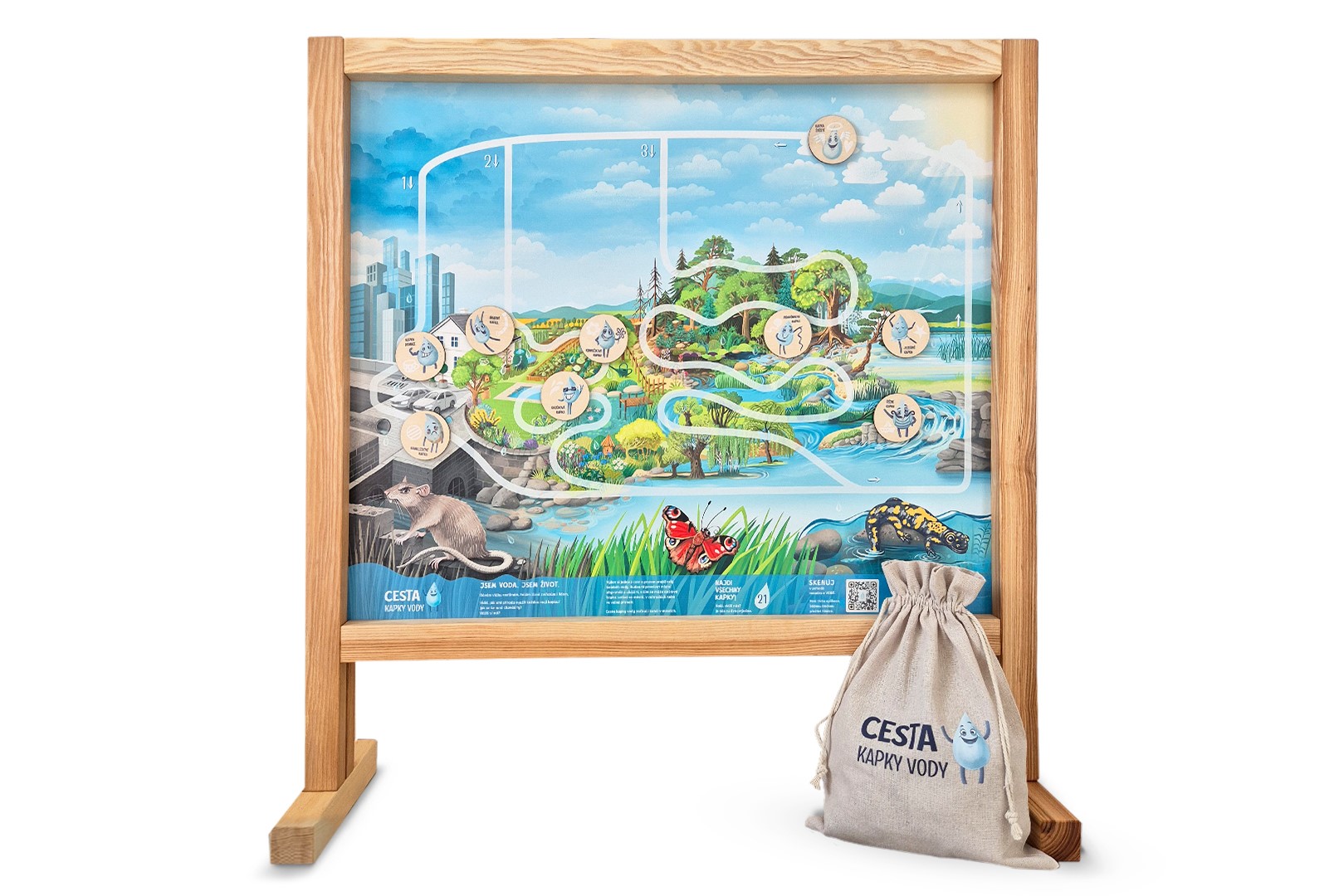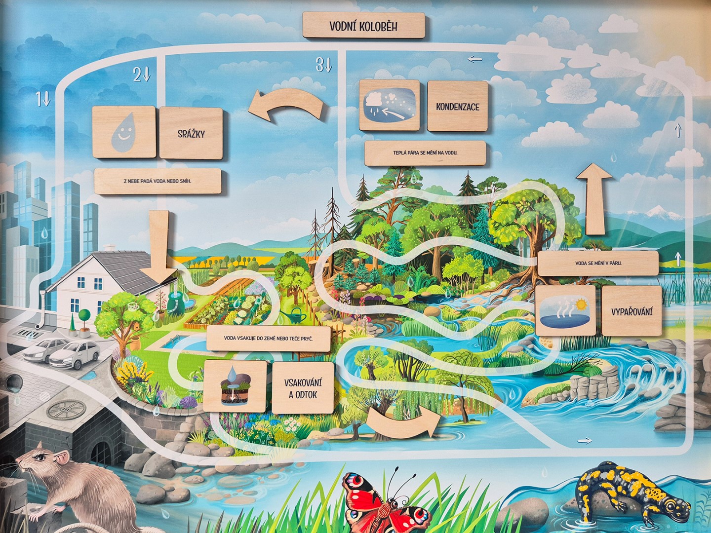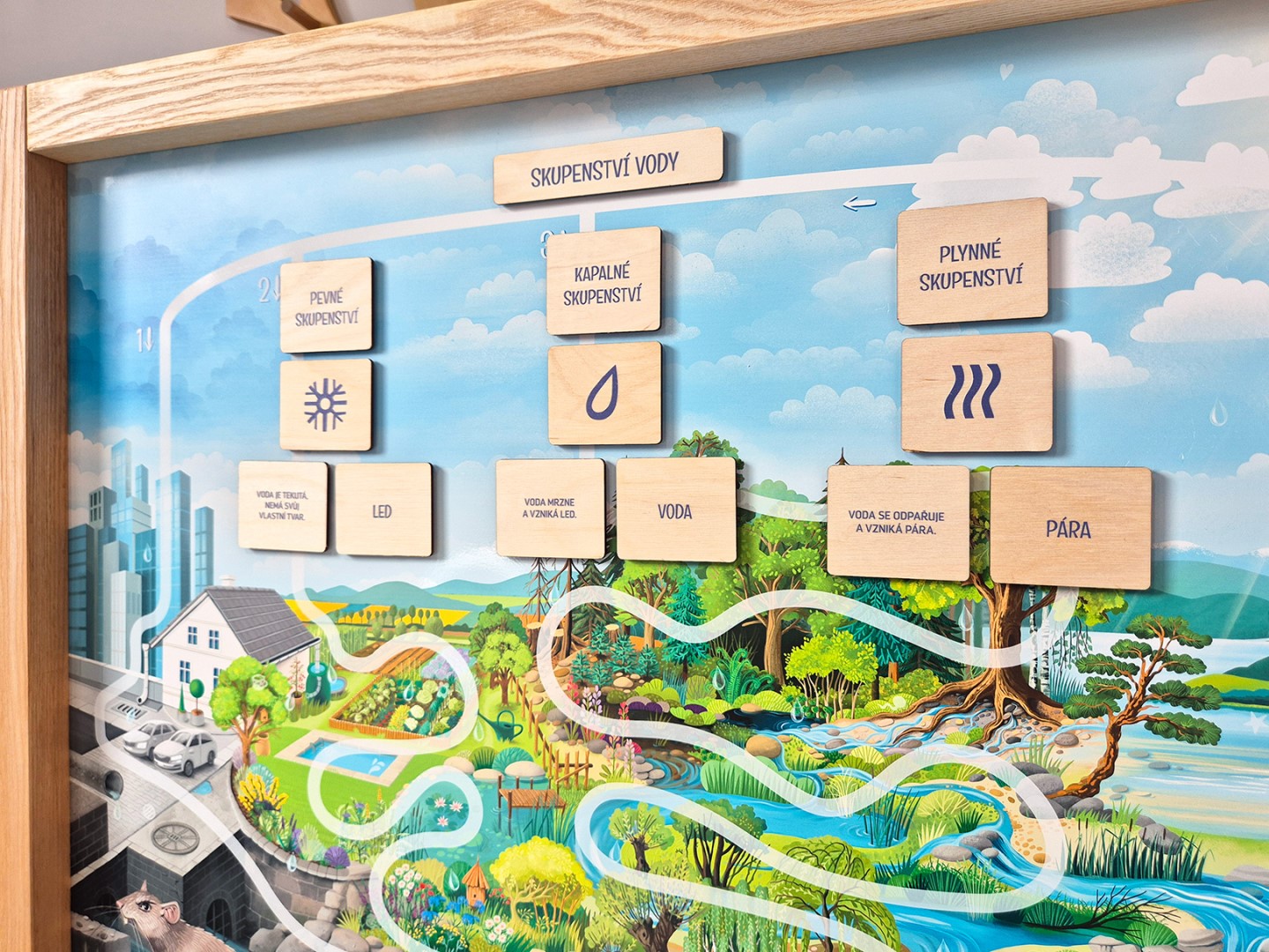 Naučná tabule spolu s magnety tvoří otevřené prostředí a vytvářejí prostor pro výklad, diskusi a kreativní výuku na téma voda v krajině a koloběh vody.