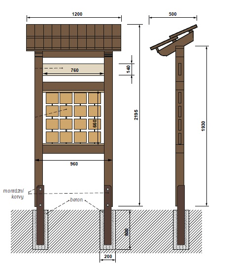 Vyrobeno z masivního smrkového KVH hranolu, voděodolné překližky a javorového dřeva. Střecha je šindelová. Součástí prvku je kotvící materiál k zabetonování (ocelová kotva L, spojovací materiál, počet dle potřeb stojanu).