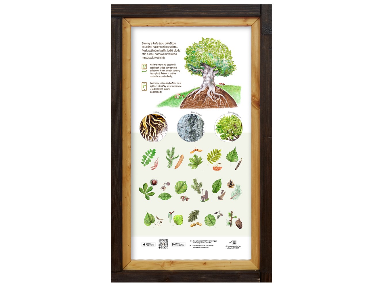 • Na jedné straně otočné tabulky je obrázek stromu a zajímavý text o dané dřevině. Na druhé straně je detail kůry stromu.